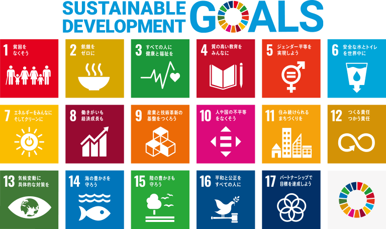 SDGs(エス・ディー・ジーズ)とは、2015年に国連サミットで採択された「Sustainable Development Goals(持続可能な開発目標)」の略称です。17の大きなゴール、169の具体的なターゲットから構成されており、”誰ひとり取り残さない”持続可能で多様性と包摂性のある社会を実現することを目標としています。