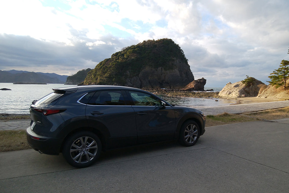 香住のカエル岩で写真を撮りましたが、夕日に映えるCX-30、カッコイイですね!!