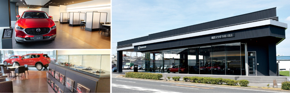 マツダでは「新世代店舗」と呼ばれる新しいコンセプトのお店を展開しています。「品格あるたたずまい」「惹きつける力」「クルマを美しく魅せる」「居心地のよいしつらえ」をテーマにモノトーンとシルバーで配色された内外装、木目調のアクセントを加えた上質で居心地のいい空間を演出しています。