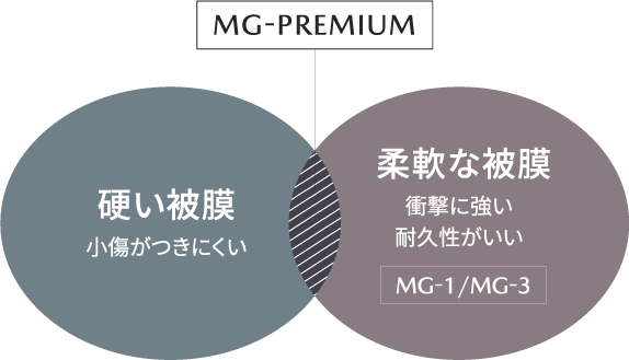 被膜の柔軟性が高かったこれまでのMGシリーズ(MG-1/3)が持つ「耐衝撃性」、「耐久性」の特性を向上させつつ、被膜硬度を約2倍 に高めることで、小傷がつきにくく、美しい塗装表面を守り続けます。