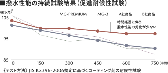 新たな撥水組成構造を採用することで、経年による撥水性能の劣化が少なく、長時間にわたり高い撥水性とお手入れのしやすさを維持します。また、繰り返し洗車によるコーティング被膜の劣化も少なく、長期間にわたり高い光沢感を維持します。