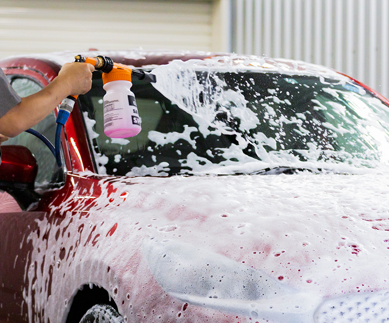 濃密な泡のクッションとムートン素材のグローブでおクルマを丁寧に手洗いします。