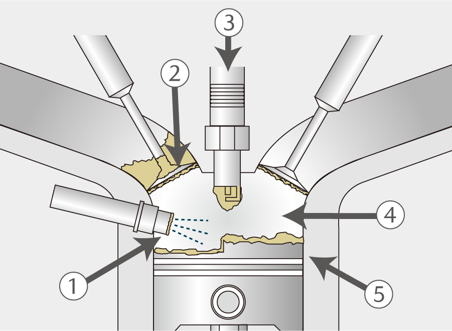 ガソリンやエンジンオイルの燃え残りが、エンジン内部(図①〜⑤)に堆積したものです。エンジン内部に汚れ(デポジット)が付着すると、“燃費の悪化” ”加速力低下” “排ガス悪化”の症状が現れやすくなります。