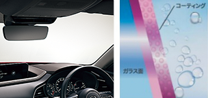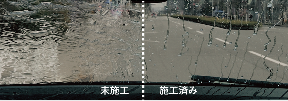 雨天時の良好な視界を確保し、運転時のストレスを軽減 優れた撥水性、撥油性、落水性により、汚れや油膜の付着を最小限に防ぎます。