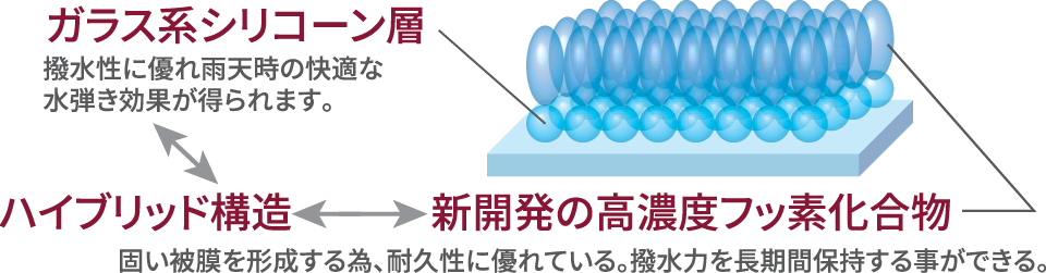 - 耐久性の高いフッ素化合物をベースにシリコーンを配合したハイブリッド構造。